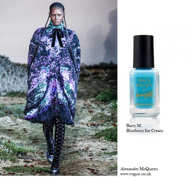 Black is black especially for A/W however especially in the case of Balenciaga blue shines through brightly, the shade of cobalt is effortlessly used to highlight shapes and textures in the designs. Follow this trend with your nails and go for a sharp cobalt blue, to bring a bit of brightness to your nails. Calvin Klein as ever kept to the brands core values of sexy, simple and chic only showing a hue of blue in the form of a dusty blue, try replicating this with a matte nail varnish or a textured nail varnish. Sarah Burton delivered once again with the Alexander McQueen show, it was dark, gothic and everything we have come to expect from the name. Mixed in with the mesmerising use of black were pops of blue and even purple, try a midnight blue colour or if you’re needing a little lift go for a baby blue and a statement black ring finger nail.