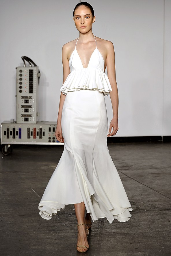 Juan Carlos Obando, I will be honest is not a designer I could talk about in detail, however this show caught my eye in a big way and I am now a fully fledged fan. The draping of the lavish fabric was effortless and there was something familiar about the styling but with a modern twist, something you may have seen on a Bond guy in the late 70’s. The frills were what caught my attention, something so simple that I thought was executed brilliantly, not to mention the use of lilac and peach which was completely memorable.
